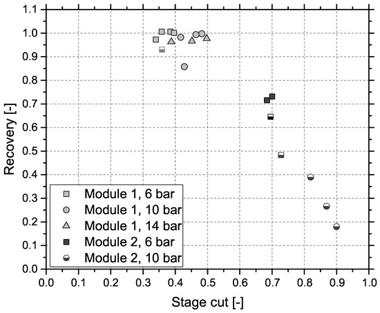 All experiments for module 1 showed an extremely high CH4 recovery of at least 0.85 and therefore little CH4 losses to the off-gas with comparatively low stage cuts ranging from 0.3 to 0.5 indicating a low off-gas flow rate. While module 2 showed more promising results regarding product gas CH4 concentration, recovery is low dropping down as far as 0.19 with high stage cuts between 0.7 and 0.9.