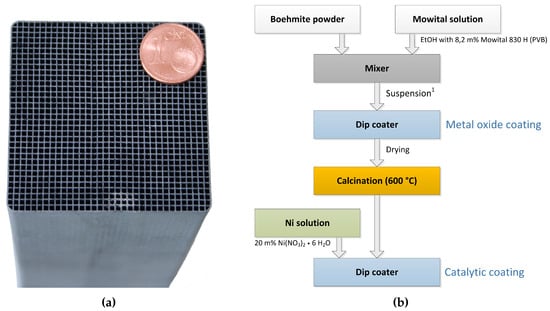 Example of honeycomb catalyst in lab scale and its coating process; (a) Honeycomb catalyst. A × B × H = 50 × 50 × 142 mm, cell density = 300 cpsi; (b) Coating process of ceramic honeycombs [30]; 1 Suspension: 60.0 g Mowital solution, 34.8 g Boehmite.