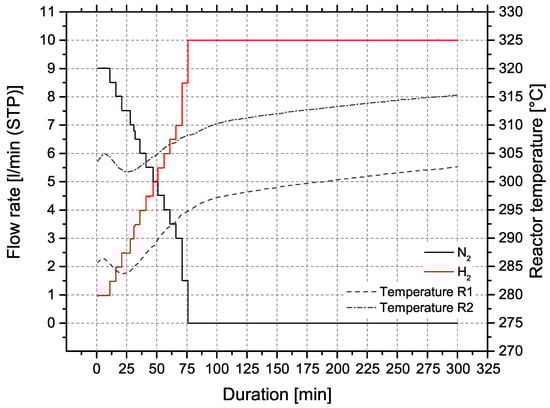 The ceramic honeycomb catalyts consist of cordierite Mg2Al3[AlSi5O18]. Compared to other substrate materials, ceramic honeycombs offer large pores and low specific surface areas of approx. 0.3 m2/g. To provide the needed surface area of >100 m2/g the carrier material is coated with inorganic oxides like -Al2O3 or 3% Y2O3-stabilized ZrO2 (t-ZrO2). In a subsequent dip coating step, the catalytic active material Ni is applied. Figure 6b illustrates the coating process for nickel/-Al2O3 catalysts on cordierite support (Figure 6a), developed by Fuchsbauer et al. [30]. In a first step, 38.4 g boehmite powder -AlO(OH) and 60.0 g binding agent (8.2 m% Mowital 830 H in ethanol) are mixed, followed by dip coating of the ceramic honeycomb. After drying and calcination at 600 °C, the catalytically active layer is applied by dip coating 20 m% Ni(NO3)2·6H2O. Finally, the coated monolith is dried to constant mass and is ready for activation in the reactor. The catalyst activation was conducted with a defined N2:H2 ratio and a temperature of 300 ± 15 °C. Figure 7 shows the activation process of both reactors at ambient pressure.