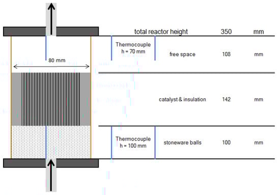 To investigate the behavior of the structured catalysts, a lab scaled test plant was used. Contrary to the planned multi bed reactor (see Figure 2), it consists of separate reactors. Due to the complexity of staged reactor systems, an implementation on a lab scale was dismissed. Similar to the proposed methanation process, the test plant includes up to three reactors, which can be operated separately or in series. Each reactor is filled with 100 mm of HiDur™ stoneware balls (RVTPE, Steinwiesen, Germany) 3/8”, in order to ensure an even flow through the catalyst, which is placed on top of the packed bed. Clearance between catalyst and reactor wall is filled with compacted insulation material (mineral wool). Furthermore, two type K thermocouples are installed inside the reactor to measure temperature directly below and above the honeycomb catalyst. A schematic illustration of reactor setup is depicted in Figure 8.