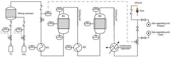 For the present experiments, only two reactors were used. The process is designed for pressures up to 20 bar and maximum feed gas flow rates of 3 m3/h (STP). A simplified flow chart is shown in Figure 9. Reaction gases H2 (Hydrogen 5.0, purity 99.999%, Linde Gas, Stadl-Paura, Austria) and CO2 (BIOGON® C, E290, purity 99.7%, Linde Gas, Stadl-Paura, Austria) are charged from gas bottles via mass flow controllers and blended in a mixing chamber. Contrary to real plants, separation of trace components like H2S or dust was not necessary. Next, the reaction gas is pre-heated in heat exchanger W1 to >200 °C and fed into the first reactor R1. To ensure a minimum reaction temperature of 250 °C, all reactors are equipped with electric trace heating systems. During operation, reactor temperatures are increasing due to the exothermicity of the reaction. Subsequently, the outlet gas of R1 is air cooled in a cooling coil to avoid temperature induced damage of valves and other equipment. The following reactor stage is similar to the first conversion step and consists of pre-heater W2, reactor R2 and a cooling coil. Finally, the produced gas is cooled and condensate is separated. A total number of four gas sampling points allows analysis of input and output gas composition of the particular reactor (infrared photometer URAS26 by ABB: CO, CO2, CH4; thermal conductivity analyzer CALDOS27 by ABB: H2, Vienna, Austria; calibrated). For the combination of methanation plant and gas upgrading unit a connection point is included. Since the gas is flammable, it has to be combusted in a lab flare before feeding it into the exhaust gas system.