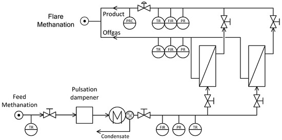To assess the influence of the membrane based gas separation unit on the process, a lab-scaled demo plant was realized. The simplified flow sheet is depicted in Figure 10. The setup consists of a pulsation dampener, condenser, membrane unit and gas analysis. Gas from methanation enters and is fed into the pulsation dampener to prevent any damage to membranes or analytic equipment in case of unforeseen pressure changes. It is then dried at 4 °C to prevent condensation on the membrane surface. Two different polyimide membranes have been used to see the effects of module size and selectivity on product gas quality, CH4 recovery and stage cut. While both modules are polyimide based with similar outer dimensions, they vary in both permeance and selectivity. Ideal selectivities and relative pure gas permeances P for both modules are given in Table 3. The selectivity of was not determined for the applied modules, but literature indicates values in the range of 2.0 to 4.5 [31]. Hence, an efficient separation of CO and CH4 with polyimide membranes is not possible.