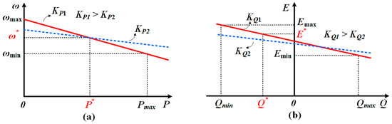In this case, droop coefficients KP and KQ restrict the range of and , respectively, and the increase of droop coefficients improves the dynamics, but it also enlarges the error range in terms of and under all load conditions, as shown in Figure 2. Therefore, in order to achieve both the same load sharing and high dynamic response in inverter-based MG applications, the tradeoff between dynamic characteristics and steady-state error should be reduced.
