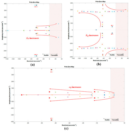 As shown in Figure 3a, the stability variations can be seen with the increasing of the droop coefficient KP (0.00001 ≤ KP ≤ 0.005), implying that a pair of poles move to the right half plane (RHP), making the system more unstable as the droop coefficient KP increases. In the case of Figure 3b, the stability analysis of the system, as the droop coefficient KQ (0.00001 ≤ KP ≤ 0.05) increases, is performed. As a result, the component of the real axis which largely influences the system stability does not change to a certain extent with the change of only the imaginary axis component; however, the component of the imaginary axis becomes fixed, and the real value becomes large so that a pair of poles makes the system unstable if the KQ is increased to a certain level. According to Figure 3a,b, the droop coefficient Kp and KQ must be less than about 0.001 and 0.038, respectively, in the stability analysis based on Table 3. Figure 3c illustrates the stability analysis with the change of cutoff frequency, implying that the larger the cutoff frequency ωf (1 Hz ≤ ωf ≤ 10 Hz), the closer to the stable region. As a result of the stability analysis based on Table 3 in Figure 3, the overall droop parameters are selected such as KP = 0.0005, KQ = 0.0001, and ωf = 10 Hz, where the poles are placed at the bold red marker in Figure 3c so that all poles are contained in the stable region.