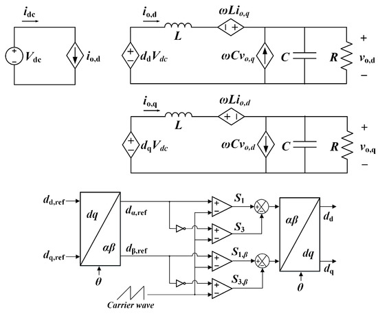 Since the d-q based model enables control using the DC value in the synchronous rotating frame, the controller performance is excellent, but it has a disadvantage that it does not reflect the actual switching characteristics. Therefore, in addition to d-q based modeling, a macro model for considering unipolar SPWM is presented and included in plant modeling. In Figure 4, based on the Boolean function of power switch Sn, the output voltage vo can be expressed using the pole voltage va, vb, as follows in Equation (32).