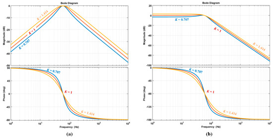 where ωn, ωo is the fundamental frequency and output of SOGI-FLL respectively and k is the gain of SOGI-FLL. The gain of SOGI-FLL k determines the damping characteristics of Equations (34) and (35), as shown in Figure 7. As k increases, the magnitude response of Gd(s) and Gq(s) become increased, resulting in the decrease of the damping ratio in the overall frequency range, but the phase response reduces in other frequency regions except for the fundamental frequency.