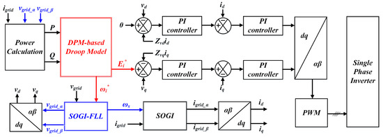 On the basis of the stability analysis result obtained by applying the system parameters to the dynamic phasor-based droop model, the droop coefficients are selected, and SOGI-FLL is applied to the control structure for the purpose of robustness against frequency fluctuation caused by the droop control in a single-phase system, as shown in Figure 9.