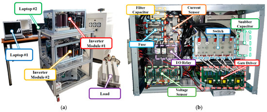 (a) Experimental setup consisting of two parallel-inverters; (b) each power stack.