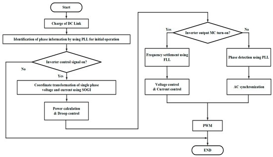 Figure 12 shows the system operation sequence of a droop-controlled parallel-inverter to stably establish the AC bus of an inverter-based microgrid. First, a phase-locked loop for detecting the phase of output voltage is required to initially generate the phase information and synchronize the output voltage. It must be performed before the control sequence starts to synchronize the output voltage of the inverter, which starts to be connected or disconnected to the AC bus of the inverter-based microgrid applications. Second, identification of the control signal of the inverter module is required to determine the operation of the inverter module. Third, the process of checking, where the magnetic contactor (MC) is open or closed on the AC output terminal, is presented against the initial operation sequence where synchronization of the AC output terminal is required. The inverter starts to synchronize the amplitude and frequency of the voltage with an open-loop considering modulation index before the inverter module is connected to the AC bus, and then it is connected to the AC bus with droop control.