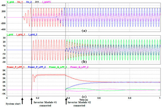 To demonstrate the proposed modeling and control strategy of an inverter-based microgrid, the simulation was performed using the PSIM simulation tool. Figure 13 shows the performance of power sharing and the seamless mode when the inverter module is connected. According to the presented system operation sequence, first, one of the inverter modules starts to generate the sinusoidal output voltage for AC synchronization, considering the modulation index of the system. After that, the output MC of inverter module #1 is closed at about 0.16 s, making output current start to flow through inverter module #1. When starting parallel-operation, specifically at 0.32 s, output voltage of inverter module #2 is also generated to synchronize with the AC bus, using phase detection using PLL in Figure 13. Finally, when the output MC of inverter module #2 starts to close at 0.38 s, two inverter modules start the parallel operation according to the proposed droop control strategy. In the simulation, the THD of output current is measured to 1.867% and the difference of power sharing between modules is measured to 21.09 W in steady state.