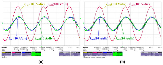 Figure 14a,b show the experimental waveforms of output voltage and current in each inverter module using the conventional droop control and the proposed control strategy respectively with a resistive load (12.4 Ω). These experimental results illustrate that current deviation of each module was reduced from 0.584 A to 0.269 A when the proposed control strategy was applied. As a result, the deviation of active power was reduced from 131 W to 60 W as shown in Figure 14.