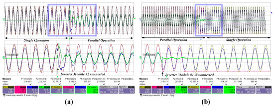 Figure 16 shows the experimental waveforms of the proposed control strategy in mode transfer, where the inverter module starts to be connected or disconnected to the AC bus. Figure 16a illustrates the waveform of the transient response in which one inverter is running and the second inverter is connected to AC bus, resulting in parallel-operation with droop control. Figure 16b shows the waveform of the transient response in which two inverters are operated in parallel and one inverter is disconnected while only one inverter operates.