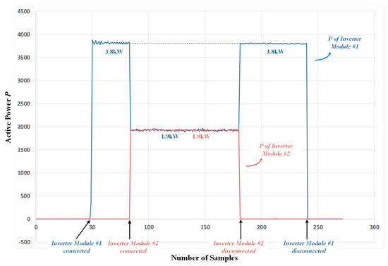 The graph of the active power according to the number of samples, by taking the value of active power output of two computers with a sampling frequency of 1 Hz by utilizing the graph window function of code composer studio (CCS), is shown in Figure 17. Specifically, Figure 17 shows the waveforms of active power shared by each inverter module when each module is connected or disconnected.