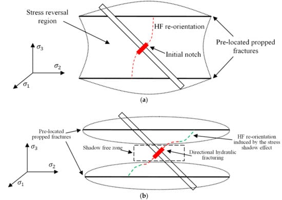 Approaches to creating PHFs []: (a) Stress shadows of pre-located fractures overlap and create a stress reversal region between them. The PHF initiates from the oriented initial notch and propagates parallel to the in-situ σ3 orientation; (b) Stress shadows of pre-located fractures do not overlap and leave a stress shadow free zone between them. Directional hydraulic fracturing is applied to control the PHF initiation direction, and the stress shadow effect is used to induce the secondary PHF re-orientation.