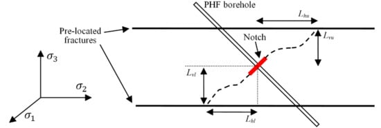 He et al. [] simulated prescribed hydraulic fracturing and studied the effects of various factors on their trajectories with the assumption that the PHF borehole lies on the σ2 − σ3 plane (Figure 2). In Figure 2, four dependent factors are used to quantify PHF re-orientation distances, including the vertical (Lvu) and horizontal (Lhu) propagation lengths of the PHF upper strand and the vertical (Lvl) and horizontal (Lhl) propagation lengths of the PHF lower strand. These factors measure how the PHF re-orientates from its preferred propagation direction and determine the PHF effectiveness in generating an additional joint set.