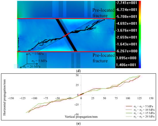 Effect of the differential stress σ1 − σ3 on PHF propagation when the PHF borehole lies on the σ2 − σ3 plane []. In the modelling scenarios in (a–d), the in-situ σ1 and σ2 magnitudes are consistent with the in-situ σ3 magnitude increased from 5 MPa to 20 MPa with an interval of 5 MPa (the legends in (a–d) show the σ3 distributions): (a) Simulated PHF trajectory with a σ1 − σ3 magnitude of 5 MPa; (b) Simulated PHF trajectory with a σ1 − σ3 magnitude of 10 MPa; (c) Simulated PHF trajectory with a σ1 − σ3 magnitude of 15 MPa; (d) Simulated PHF trajectory with a σ1 − σ3 magnitude of 20 MPa; (e) Superimposed PHF trajectories from modelling results in (a–d). The superimposition shows the change of the differential stress σ1 – σ3 magnitude has limited influence on PHF propagation.