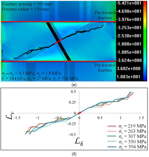In Set 7, which is based on the E26 orebody characteristics (Table 11), the feasibility of prescribed hydraulic fracturing in the E26 orebody is studied. The differential stress between the in-situ σ2 and the in-situ σ3 in the E26 orebody is 3 MPa, which may favour HF re-orientation against its preferred direction. In Cases 7-1 to 7-3, the pre-located fractures have radii of 7.5 m with spacings of 5 m. The fracture radius is less than that in current cave mining hydraulic fracturing, which may reach 30 m. As discussed in He et al. [], the main function of the pre-located fracture in prescribed hydraulic fracturing is its influence on the local stress change, specifically, on the stress shadow.