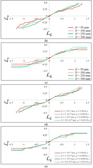 Modelling results of Sets 2 to 6 in Table 6, Table 7 and Table 8 []. The superimposition in each figure in (a–e) indicates that the modelling scenarios in each modelling set have similar dimensionless PHF trajectories: (a) Superimposed dimensionless PHF trajectories in Set 2 in Table 6; (b) Superimposed dimensionless PHF trajectories in Set 3 in Table 7; (c) Superimposed dimensionless PHF trajectories in Set 4 in Table 7; (d) Superimposed dimensionless PHF trajectories in Set 5 in Table 8; (e) Superimposed dimensionless PHF trajectories in Set 6 in Table 8.