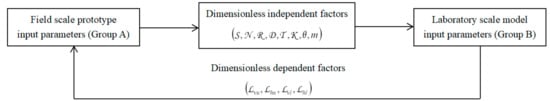 - Determining the values of the input parameters in the laboratory-scale numerical model (i.e., Parameter Group B in Figure 6). The numerical model has much smaller size (laboratory scale) than the field scale prototype and would also have scaled rock properties from the rock mass. The values of the dimensionless independent factor groups (Equation (1)) in the numerical model must be consistent with that in the field scale prototype. For example, if the differential stress magnitude in the numerical model is three times that in the field scale prototype, the rock UCS in the numerical model should accordingly increase by two times based on the form of the dimensionless differential stress (Table 5).