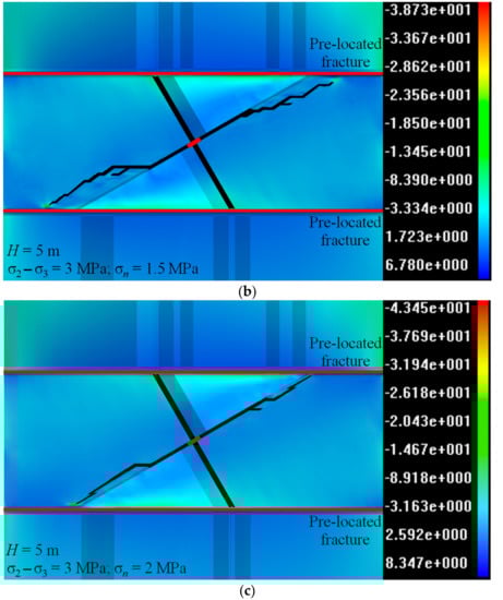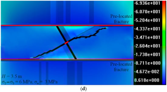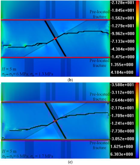 In field applications, the induced stress shadow effect of the pre-located fracture might be weakened by the non-uniform distribution of the proppant; the potential screen out; and the interaction between the HF and the NF network []. These phenomena decrease the amount of proppant injected into the HF and weaken the induced stress shadow effect [,]. Hence three scenarios are studied in which the net pressure magnitude changes from 1 MPa to 2 MPa with an interval of 0.5 MPa to consider PHF propagation with different proppant efficiency. The net pressure magnitudes are in a reasonable range since the stress change monitoring performed by Mills et al. [] at Northparkes Mines showed the induced stress change observed 14 to 48 meters above a single HF was from 0.5 MPa to 1.4 MPa.