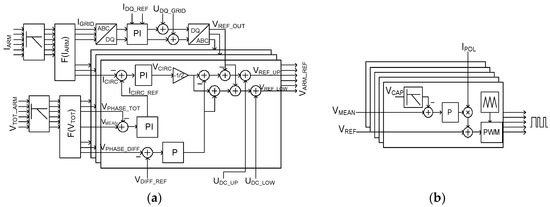 (a) MMC control strategy diagram. IARM are the six arm currents of the MMC, IGRID are the three line currents of the utility grid computed using the block F(IARM) from the arm’s currents. ICIRC are the three-circulating currents in each phase of the MMC computed by the block F(IARM). ICIRC_REF is the circulating current reference in each phase. IDQ_REF are the AC line current references in the dq frame. UDQ_GRID are the three AC grid voltages in the dq frame. VREF_OUT are the three AC grid voltage references given by PI controllers. VTOT_ARM are the six total arms’ voltages. VPHASE_TOT is the total voltage of each phase of the MMC. VPHASE_DIF is the voltage difference between the upper and lower arms of the same phase. VDIF_REF is the voltage difference reference between the upper and lower arms of the same phase. UDC_LOW and UDC_UP are the half of DC grid voltage. VMEAN is the mean voltage of each phase. VARM_REF are the six arms’ voltage references given by the controller. P is a proportional controller; (b) Submodules capacitors voltage balancing strategy: VMEAN is the mean voltage of each arm. VCAP is the capacitor voltage of each submodule. VREF is the voltage reference of each submodule capacitor. IPOL gives the sign of the arm current. PWM is the block generating gates signals.