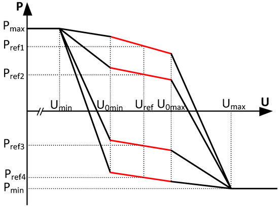 In the voltage droop control method, the DC voltage variation is used as a common signal by all converters that adjust their power based on this DC voltage. Thus, the task of controlling the DC voltage is shared among all the converters. To stabilize the MTDC system, a dead zone can be added to the droop control setting, also called dead-band voltage droop control. This allows discrimination between normal and disturbed operation of the MTDC system. However, the control activity of the converters within the band (normal operation) is fully lost. This has the disadvantage that some of the droop control parameters are set to zero and infinity, which does not give any degree of freedom for optimization [34]. In the non-dead band voltage droop control, the dead zone is replaced by a real power-voltage characteristic slightly inclined. Therefore, different droop constants can be used, depending on the deviation between DC voltage set-point and measure. Several control characteristics of a non-dead band voltage control scheme are shown in Figure 3: a reference voltage and power are set for each converter, and the balancing of the system occurs by increasing the DC voltage in case of excess of power, while decreasing it otherwise. The slopes of the different sections of the characteristic are chosen according to the connected loads or sources (e.g., wind generators cannot usually provide large amounts of additional power). This method is effective to ensure stable operation of the DC network, also in case of a failure of one or even several converters.