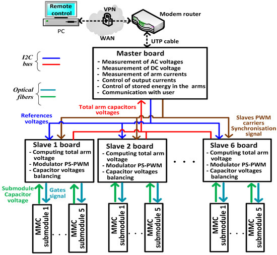 All control and communication tasks are distributed between the “master” controller and the arms “slave” controllers. The master controller manages the real and reactive power flow, and the communications tasks with the external world. The master controller communicates to the six slave controllers the voltage references, the arm current signs, the synchronization signal of the arm controllers and other commands such as start driving submodules. Each slave controller periodically sends back to the master the total arm voltage and performs the balancing of its arm capacitor voltages using the arm current sign received from master.