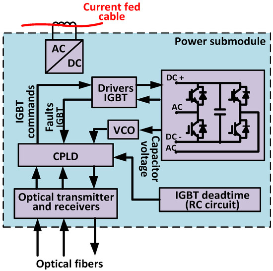 The main tasks of the slave controllers consist of receiving each capacitor voltage, performing capacitor voltage balancing and generating command signals for each submodule. The slave controllers communicate with the master board using inter-integrated circuit bus (I2C), and with submodules using optical fibers. This ensure the insulation requirements between the control board and the power boards. The advantages of I2C bus are the reduced number of wires and the quite simple implementation in a multi-slave environment. The I2C fast mode has been chosen with a clock frequency of 350 kHz. Each arm controller is implemented using a TMS320F28335 TI C2000 DSP family. The frequency sent by the power submodule for the capacitor voltage measurement is measured by the enhanced capture (eCAP) peripheral of the DSP and then converted into voltage. The power submodules are driven by the slave controller through optical fibers. To prevent faults and generate the dead-times, the signals are pretreated by a programmable logic device (CPLD) before being sent to the gates. The capacitor voltages are measured using a voltage-controlled oscillator (VCO) which converts the capacitor voltage into a variable frequency signal. It is then sent to the corresponding arm controller through an optical fiber link. In this application, for a capacitor voltage range between 1 and 250 V, the VCO frequency varies linearly from 3 to 450 kHz. Each module has DC bus connectors and AC output connectors (middle points of H-bridge arms). Two PWM input signals are available to control the two IGBT legs. A 3.2 mF capacitor is connected between the DC bus for local power storage. In this paper, two IGBTs only (half-bridge operation) are mounted in the power module, requiring just one PWM input. The nominal ratings of the module are 10 A and 200 V, with some 1 kV isolation voltage. The low power supply for the sub-module is provided by a medium-frequency current-fed system, consisting of an isolated power supply and a cable passing through thirty small torus from the secondary of each torus, one for each sub-module [36]. An inverter fed a nominal current of 5 A in the cable at 45 kHz. Figure 5 presents the sub-module schematic and its hardware implementation. Table 1 give some specifications of the main power submodules devices.