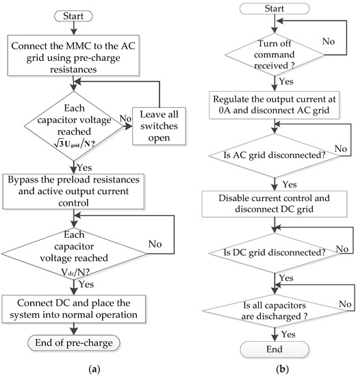 Once the master controller receives start command from UI, switches connect the converter to the grid through pre-charge resistors. Flowcharts of the pre-charge and the shutdown of the MMC are presented in Figure 6.