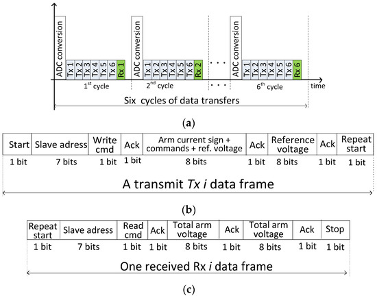 Figure 7a shows the master controller data transfer process to the slaves in six sampling periods. Figure 7b,c show the communication protocol developed to meet the data transfer needs. The voltage references are coded with 12 bits.