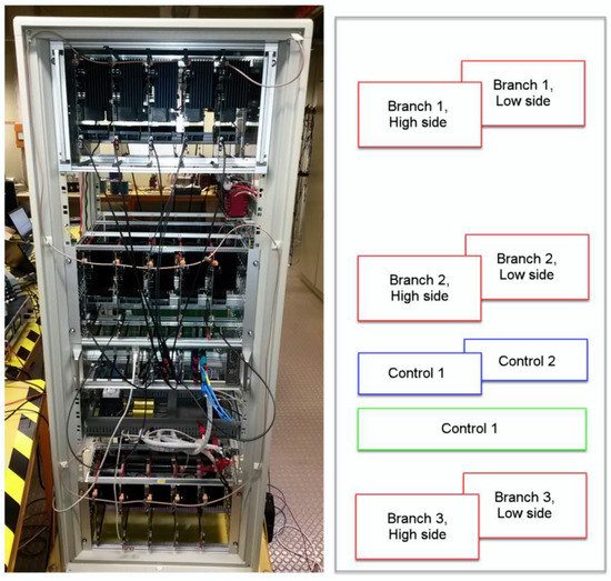 The proposed architecture has been implemented on a 5 kW reduced-scale MMC demonstrator. Figure 8 shows the whole MMC demonstrator. The main system parameters are shown in Table 2. Tests have been carried out with MMC working as inverter on a three-phase passive load with a DC link of 800 V and in a reduced-scale laboratory setup of a MTDC transmission network [25,37].