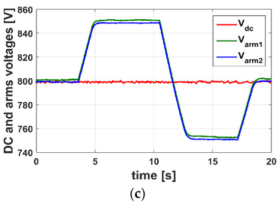 Hence the DC voltage is not decoupled from capacitor voltages. If a short time brake occurs in the DC bus, this will directly affect the capacitor voltages. In Figure 13b,c, the energy control is enabled. In Figure 13b, the total arm voltages are controlled at 800 V and the DC voltage steps successively from 800 V to 850 V, from 850 V to 750 V and from 750 V to 800 V. After a short transient phase, the total arm voltages remain at their reference value. In Figure 13c, the DC voltage is held at 800 V and the total arm voltages are set to step successively from 800 V to 850 V, from 850 V to 750 V and from 750 V to 800 V. The energy control allows a decoupling between capacitor voltages and the DC bus voltage. The dynamics of the total arm voltage control loop has been intentionally reduced to avoid overvoltage on the capacitors.