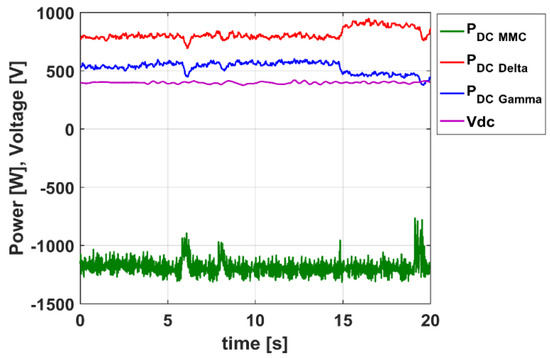 In a first test, different power profiles have been imposed on the AC side and corresponding powers are absorbed by the MMC on the DC side, as illustrated in Figure 15a. On the DC side, the stability of the DC network is secured, showing the effectiveness of the non-dead band voltage control. On the MMC side, the energy control allows maintaining of a stable voltage in the converter’s sub-modules, decoupling them from the DC-link voltage variations as illustrated in Figure 15b.