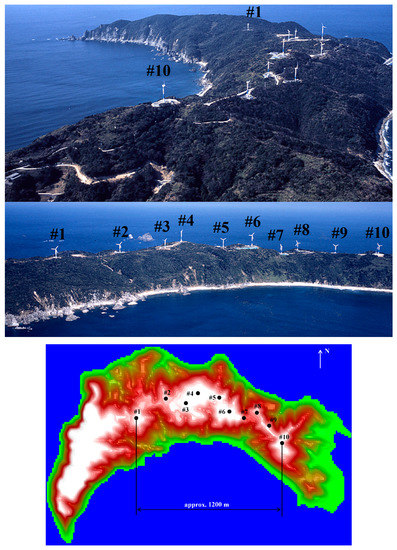 Noma Wind Park is in Minami Satsuma City in the southwestern part of Kagoshima Prefecture, Japan (marked by the circle in Figure 1). The terrain at and in the surrounding area of Noma Wind Park is steep complex terrain (Figure 2). While the wind park is surrounded by the ocean, a steep cliff with a slope angle of more than 30 degrees is at the western end of the cape. The maximum elevation of the terrain surface is 143 m. In Noma Wind Park, ten WTs that are owned by Kyushu Electric Power Co., Inc. (Fukuoka, Japan), have been deployed, and verification tests have been conducted. The rated output of each WT is 300 kW; thus, the total rated output from the ten WTs combined is 3000 kW. Table 1 and Table 2 give an overview of the WTs deployed in Noma Wind Park.