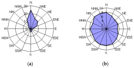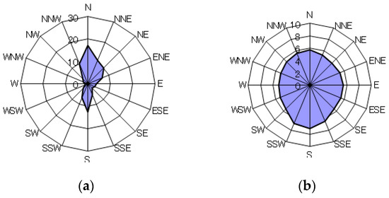 Propeller vane anemometers are mounted on all of the WTs deployed in Noma Wind Park (indicated by “A” in Figure 3). The present study employs time-series observation data from these propeller vane anemometers. The data were recorded every one minute. Details of the wind characteristics at Noma Wind Park from June 2002–May 2003 are summarized in Uchida. According to Uchida, the prevailing wind direction at this site is northerly, and the monthly average wind speed is large from November–March (see Figure 4 and Figure 5). The present study validates the proposed procedure for predicting the actual wind speed with the use of observation data from February 2003, the month during the observation period in which the least data are missing for all ten WTs and also in which the value of the monthly average wind speed is large. For February 2003, 40,047 and 273 data values are available for analysis and missing, respectively (percentage of non-missing data: 99%).