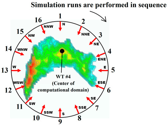 Step 2. For each inflow direction (Figure 6), the ratio of the simulated hub-height wind speed at a prediction point to the simulated wind speed at the height of an observation pole, that is, at the reference point, is computed, yielding a set of 16 wind speed ratios for the prediction point. The value of the wind speed at the reference point is normalized as “1”. In this step, the wind direction set at the inflow boundary is assumed to match that at the reference point. In the present study, points located at WT #4 and WT #6 at the hub-height are used as the reference points (hereafter, in the context of reference points, these reference points will be referred to as WT #4 and WT #6). Thus, the following wind speed ratios are evaluated: WT #1/WT #4, …, WT #10/WT #4; WT #1/WT #6, …, WT #10/WT #6. To compute these wind speed ratios, the scalar wind speed, VEL, is used in both the denominator and numerator and is computed from the time-averaged wind velocity components in the x- and y-directions. Here, the physical quantity referred to as VEL is defined as follows:
