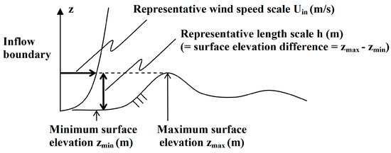 The computational domain is a square with 5 km sides with WT #4 in the center of the domain (Figure 6). The top boundary of the computational domain is set to 700 m. Terrain features are reconstructed with the use of high-resolution (5 m horizontal spatial resolution) surface elevation data. The numbers of computational grid cells are 51 (streamwise (x)) × 51 (spanwise (y)) × 41 (vertical (z)). Variable grid pacing is used in the x- and y-directions so that the grid density increases toward the center of the domain. Likewise, variable grid spacing is used in the z-direction so that grid density is highest near the ground surface. The vertical height of the first layer of grid cells, that is the minimum vertical grid height, is approximately 2.5 m. A vertical profile of wind speed based on the 1/7 power law is given for the inflow boundary. The free-slip condition is set for the side and upper boundaries. The convective outflow condition is applied to the outflow boundary. On the ground, the no-slip condition is imposed. The non-dimensional parameter, Re, in Equation (2), defined as Uin h/ν, is the Reynolds number and is set to 104. Here, h indicates the difference between the minimum and maximum surface elevations within the computational domain (h = 143 m). Uin represents the wind speed at the inflow boundary at the height of the maximum surface elevation in the computational domain, and ν is the coefficient of kinematic viscosity. The representative scales used for the present simulations, h and Uin, are shown in Figure 7. The time step in the model is set to ∆t = 2 × 10−3 h/Uin.