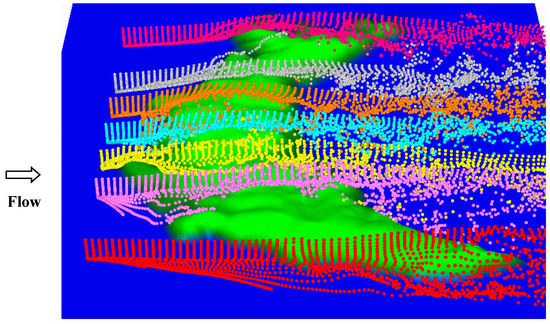For the computational algorithm, a fractional step (FS) method [23] is used. A time marching method based on the Euler explicit method is adopted. Poisson’s equation for pressure is solved by a successive over-relaxation (SOR) method. For discrimination of all the spatial terms in the governing equations except for the convective term in Equation (2), a second-order central difference scheme is applied. For the convective term, a third-order upwind difference scheme is used. For the fourth-order central difference term that constitutes the discretized convective term, the interpolation technique of Kajishima [24], which is based on a four-point difference scheme and a four-point interpolation scheme, is used. For the weighting of the numerical diffusion term in the discretized convective term, α = 3.0 is commonly applied in the Kawamura–Kuwahara scheme [25]. However, α = 0.5 is used in the present study to minimize the influence of numerical diffusion. For the LES subgrid-scale modeling, the standard Smagorinsky model [26] (Equations (3)–(8)) is adopted with a model coefficient of 0.1 in conjunction with a wall-damping function.