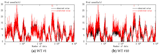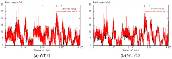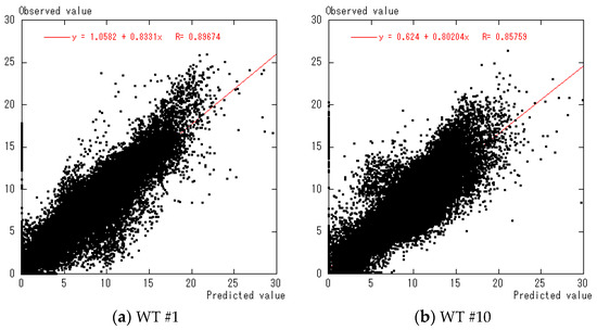 Figure 9 shows comparisons of the observed and predicted time-series of scalar wind speed for the hub-height of WT #1 and WT #10. To obtain the predicted scalar wind speed in this figure, WT #4 was used as the reference point. Figure 10 shows scatter plots of the observed and predicted scalar wind speed from Figure 9. Figure 11 also shows comparisons of the observed and predicted time-series of scalar wind speed for the hub-height of WT #1 and WT #10; however, WT #6 was used as the reference point for the prediction of the scalar wind speed. Scatter plots for the data in Figure 11 are shown in Figure 12. In both the case of using WT #4 and the case of using WT #6 as the reference points, the proposed procedure for predicting the actual wind speed yielded predicted values that agree well with the observed values.