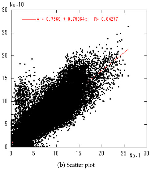 In regards to the previously discussed range of application for the proposed actual wind speed prediction procedure, the subsequent analysis examines, based on the observation data, the characteristics of airflow over complex terrain, which serve as supporting evidence for the range of application for the procedure. Figure 13 shows a comparison of the time-series of the observed wind speed from WT #1 and WT #10 and also a scatter plot of the observed wind speed from the two WTs for February 2003. The horizontal separation distance between the two WTs is as much as approximately 1200 m, and the elevation difference between the two WTs is 9 m (see Figure 2). In particular, attention should be given to the horizontal separation distance. Even though the horizontal separation distance between WT #1 and WT #10 is more than 1000 m, the temporal changes of the wind speed over the course of one month at WT #1 and WT #10 are quite similar. The correlation coefficient between the two datasets plotted in Figure 13b is 0.84.