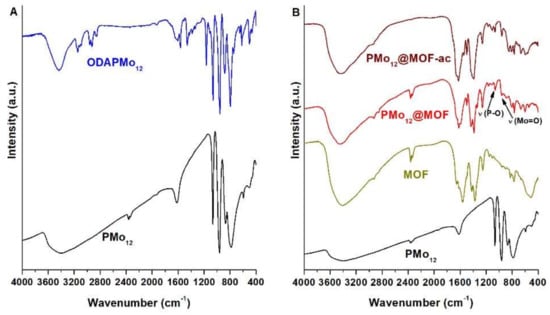The FT-IR spectra of PMo12 and ODAPMo12 display the bands associated with the POM stretching modes, namely the bands assigned to νas(P–O) vibrations at 1063 cm−1, terminal νas(Mo=O) at 956 cm−1, corner-sharing νas(Mo–Ob–Mo) at 879 cm−1, and edge-sharing νas(Mo–Oc–Mo) at 796 cm−1 (Figure 1) [15,16]. For ODAPMo12, the spectrum displays the typical bands of the organic cation, which can be assigned to νas(C-H) and νs(C-H) stretches located at 2920 and 2850 cm−1, respectively, as well as a δ(C-H) bending mode at 1464 cm−1 [17]. The PMo12@MOF spectrum (Figure 1B) shows the characteristic bands of the amino-functionalized MIL-101(Cr) support [18] together with the bands associated with the PMo12 stretching modes (νas(P–O) at 1061 cm−1 and νas(Mo=O) at 958 cm−1). Elemental analysis of PMo12@MOF for the Mo content revealed a POM loading of 0.122 mmol·g−1. The presence of amine groups in the MOF structure leads to a high POM loading since it allows a more efficient immobilization of the anionic PMo12 via electrostatic interactions. Similar results have been reported for the incorporation of the phosphotungstate Keggin analogue in amine-functionalized MIL-101(Cr) [19].