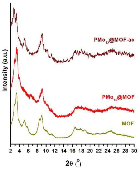 The powder XRD pattern of the PMo12@MOF composite exhibits a similar profile to the pattern of the MOF support, suggesting the preservation of the MOF crystalline structure in the final composite (Figure 2). The position and intensity of the peaks in both XRD patterns are in good agreement with previously reported data for NH2-MIL-101(Cr) [18,20,21,22].
