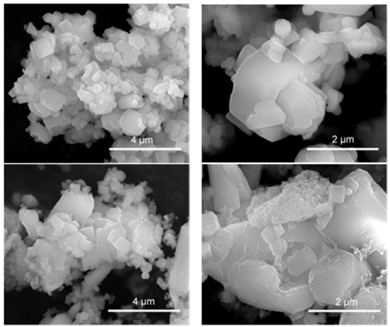 SEM images of the PMo12@MOF composite material before (top) and after (bottom) catalytic utilization (PMo12@MOF-ac) at different magnifications: (left) ×25,000 and (right) ×50,000.