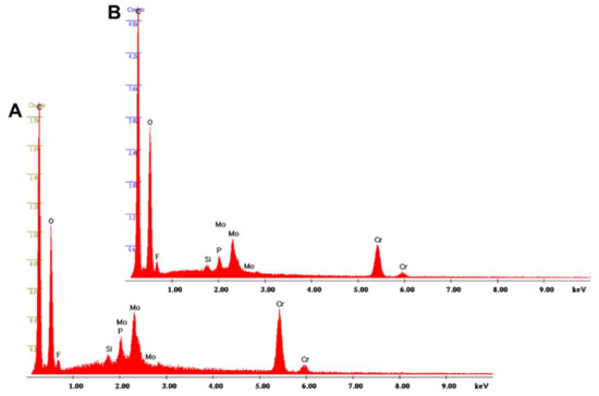 The SEM images of PMo12@MOF (Figure 3) show the typical morphology of NH2-MIL-101(Cr) composed of cubic micro-crystals [18,19,23]. Energy dispersive X-ray spectroscopy revealed the presence of chromium from the support as well as phosphorous and molybdenum from the impregnated POM (Figure 4).