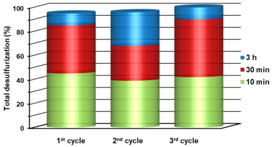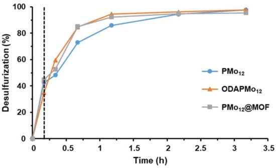The results obtained in the desulfurization of the model diesel using the three different catalysts are compared in Figure 5. At the end of the initial extraction, the system using the PMo12@MOF catalyst allowed the highest desulfurization percentage of 45%. Most likely, this result is due to the presence of an extensive porous framework for NH2-MIL-101(Cr) that contributes to a higher degree of contact between the phases [14,28]. After the addition of H2O2, the ODAPMo12 and PMo12@MOF catalysts exhibit similar desulfurization profiles with remarkable efficiency. After just 40 min of ECODS process, both catalysts allowed approximately 1690 ppm of sulfur to be removed, corresponding to a desulfurization of 85%. Moreover, only 2 h of the catalytic stage are necessary to achieve practically complete desulfurization of the model diesel (96 and 95% using ODAPMo12 and PMo12@MOF, respectively). Some examples can be found in the literature for PMo12-based catalysts and their application in oxidative desulfurization [10,11,29,30,31]. A composite material consisting of PMo12 immobilized in the copper-based MOF HKUST-1 gave similar desulfurization values (for a model diesel using H2O2 as the oxidant) to those found in the present work, although Rafiee et al. used a higher temperature and H2O2/S ratio [31]. In another report, NH2-MIL-101(Cr) was used as a support to incorporate the tungsten analogue Keggin anion [19]. The resulting PW12@MOF proved to be an efficient and recyclable catalyst for ODS, allowing the complete conversion of DBT after 1 h during six cycles. This ECODS system used mild conditions identical to those used here, but was evaluated with a single-component model oil rather than a multicomponent model diesel containing a mixture of sulfur compounds more difficult to oxidize than DBT. ODS of the sulfur components follows the order: DBT > 4-MDBT > 4,6-DMDBT > BT as previously reported for POM-catalyzed ODS systems with H2O2 [28,32,33,34]