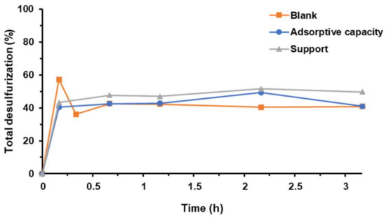 Kinetic profiles for the desulfurization of a multicomponent model diesel in a biphasic system (diesel/[BMIM][PF6]) using the MOF support, a blank experiment (without any catalyst) and the adsorptive capacity of PMo12@MOF (without oxidant) at 50 °C.
