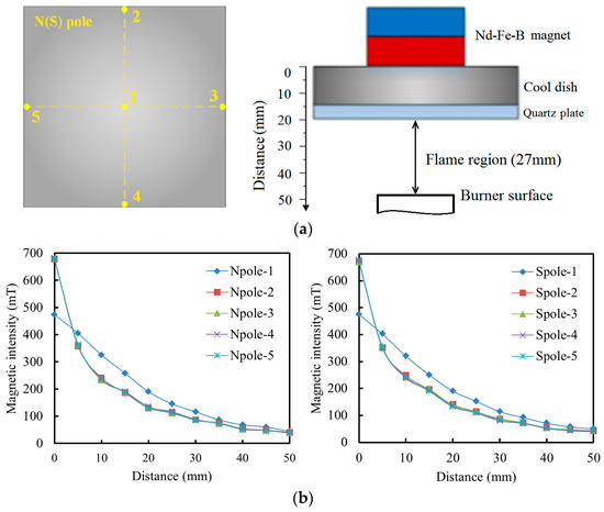 Magnetic fields were supplied by a strong magnetic Nd-Fe-B permanent magnet (50 mm × 50 mm × 35 mm). Nd-Fe-B magnet was located at the top of the aluminum cool dish which cannot be magnetized. Without magnet represents the cases of without effects of magnetic fields, N pole and S pole represent the cases of N pole and S pole of the magnet facing the flame, respectively. Magnetic fields intensity of Nd-Fe-B magnet used in this study were measured by a high-precision gauss meter. The magnetic field intensity in each measurement point was monitored for five times, the average value was obtained. The measurement points and the distribution of magnetic field intensity were shown in Figure 2. The magnetic field could change the flow rate, the mixing of the flame compounds, flame height and lift-off height, maximum temperature, soot inception occurred, and so on. These effects are attributed to the magnetic force, which develops on air via its action on the paramagnetic oxygen molecules [55,56,60,61,62,63]. Oxygen exhibits a relatively high paramagnetic susceptibility. It is known that the single magnet offered the non-uniform magnetic field. The gradient of the magnetic field increased from the center point 1 to the edge positions of the magnet as point 2/3/4/5 as shown in Figure 2a and decreased away from the surface of the magnet. Therefore, no matter in case of N pole or S pole, oxygen molecules has the net magnetic force F = Foutside − Finside facing the central line and the inner direction of the flame as shown in Figure 2d.