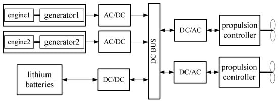 The power system of hybrid power ship in this paper consists of two diesel generators, AC/DC, DC/DC, DC/AC converters, lithium batteries, DC bus, propeller and propulsion controller comprised of motor controllers, drive motor, and gearbox. Diesel generators and the lithium battery set can power the electric propulsion controller together; they can also power the controller separately. The generators can also charge the battery. The schematic structure of hybrid power ship is shown in Figure 3.