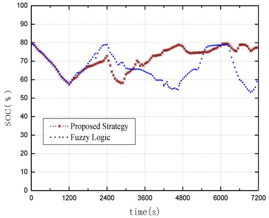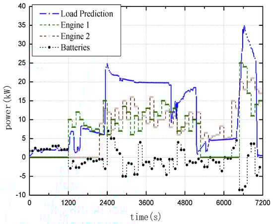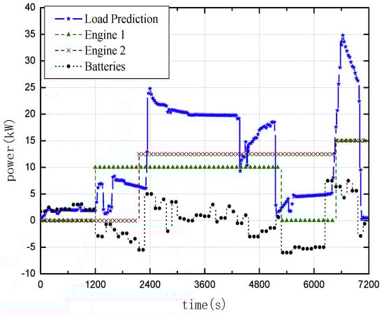 To better illustrate the optimization effect of the proposed strategy, the energy management strategy based on fuzzy logic rules [] is adopted for comparative study. The results of the fuzzy logic based strategy for the output of diesel generator set and battery pack are shown in Figure 6.