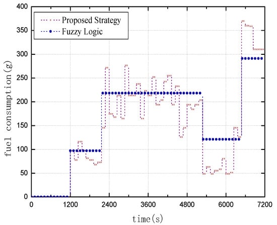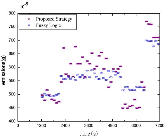 Figure 8 shows the overall distribution of the comprehensive emission of the two compared strategies under all of the operating conditions. The experimental data show that the total emission of the proposed strategy is slightly higher (by 9 g) than that of the fuzzy logic based strategy. The total emission is mainly determined by the torque and speed of the diesel engine. Although the total fuel consumption of the strategy is lower than the fuzzy logic rules based strategy, the output power of the proposed strategy diesel engine is lower in this part of the operating time and it is farther from the comprehensive emission best area of the diesel engine. This also shows that the improved NSGA-II algorithm proposed in this paper adopts the Pareto non-dominant principle to deal with the relationship between various objectives. It is not necessary to specify the weight coefficient of each target to obtain the real trade-off characteristics of the Pareto solution set.
